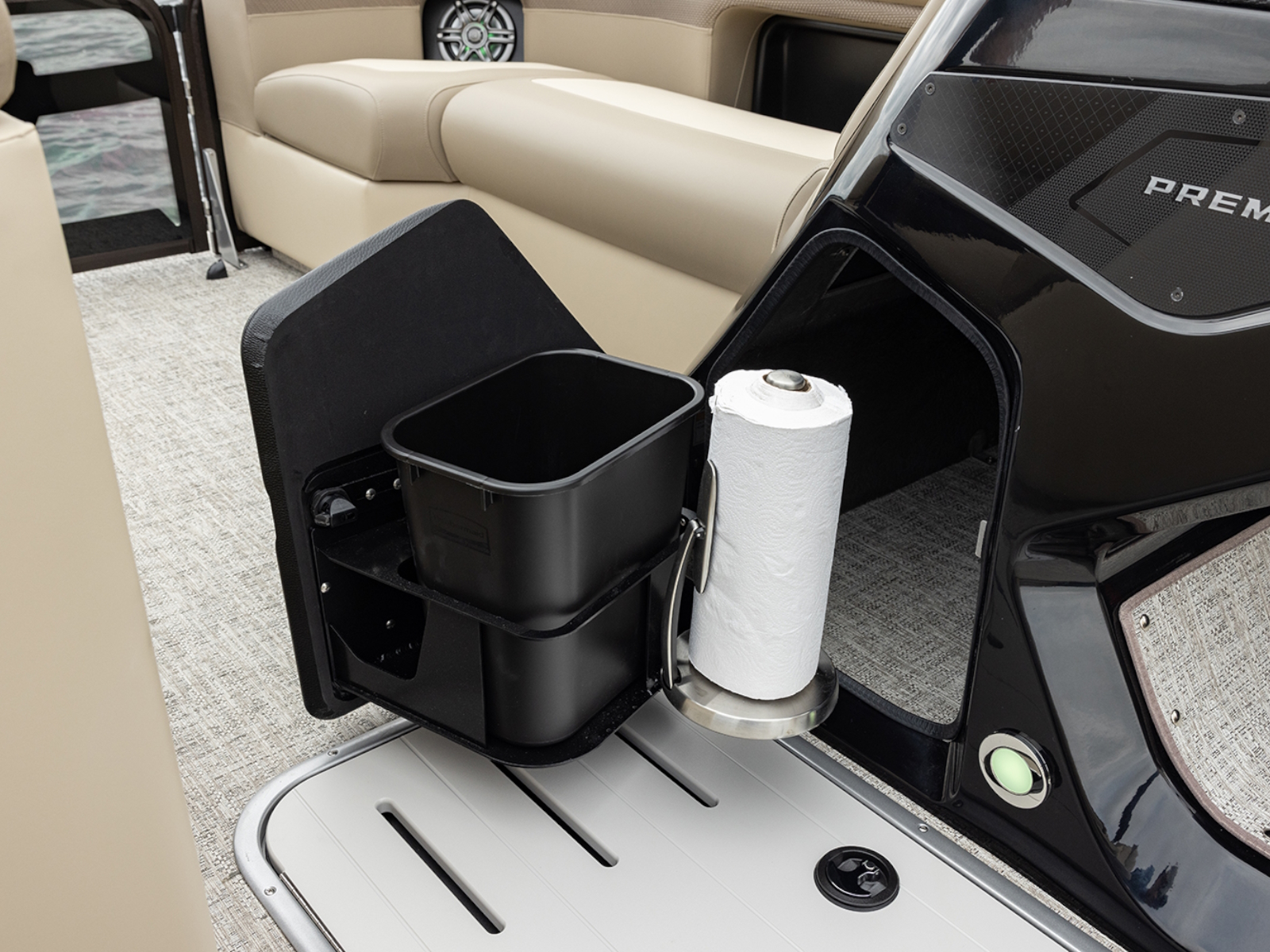 - Storage with trash can and paper towel holder