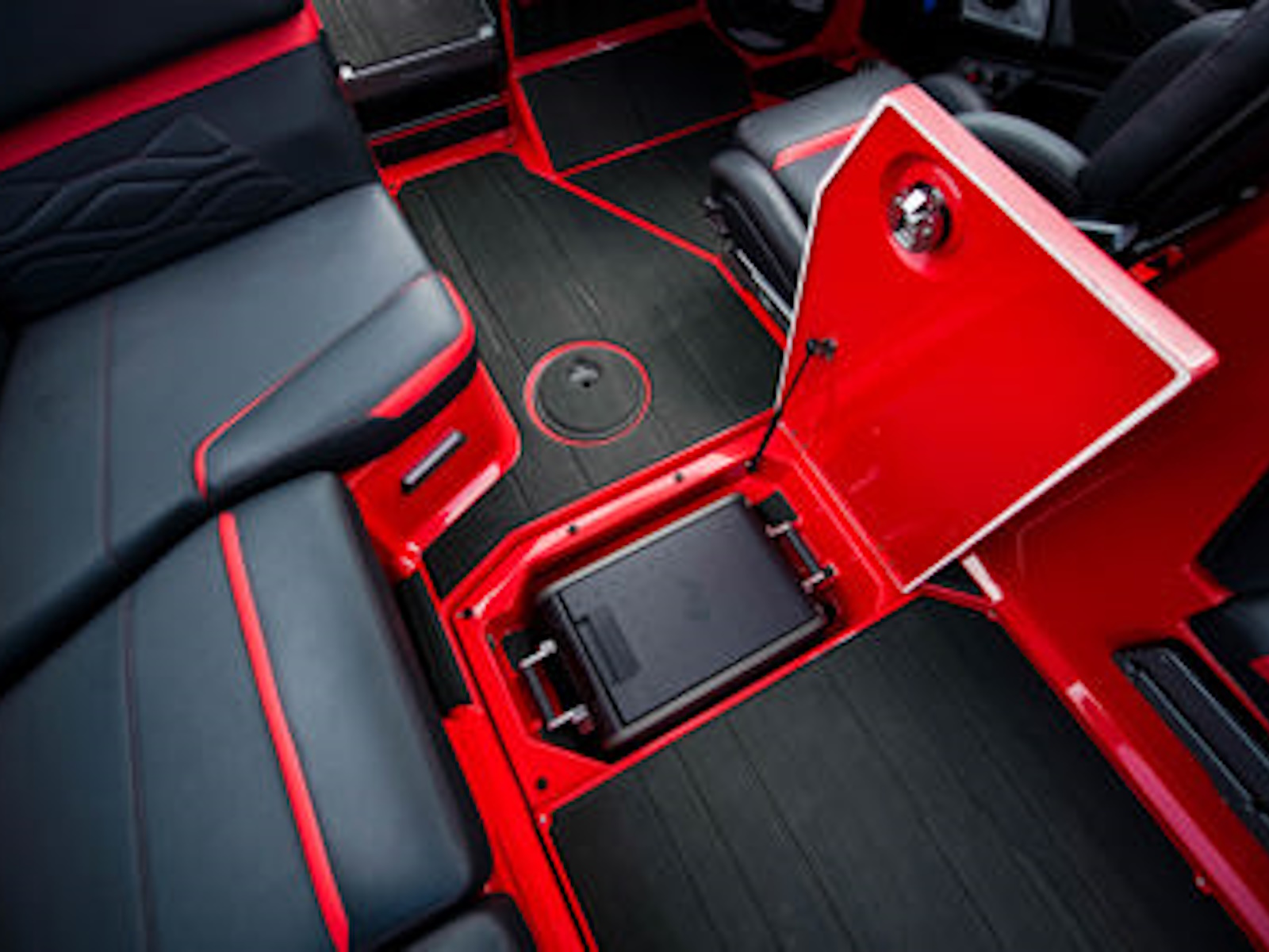 New built-in transom seating offers comfort without sacrificing access to the rear surf storage locker.